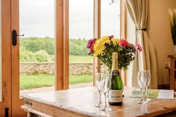 Floor to ceiling windows with garden access, spectacular valley views, American-style fridge/freezer, electric oven, electric hob, dishwasher, microwave, kettle, toaster, cafetière, large dining table with seating for eight, two three-seater sofas and Smart TV with Amazon Fire Stick (account holders only)