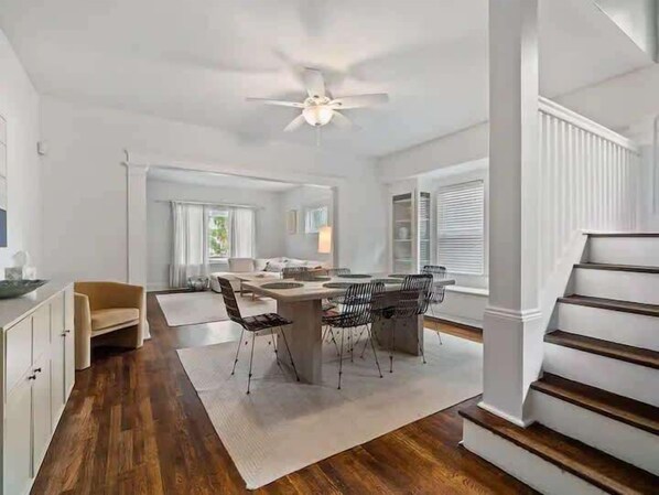 Huge side by side in desirable Edgewater Neighborhood of Cleveland. Featuring three floors of living space! Main floor features hardwood floors throughout living room, dining room, kitchen and 1/2 bath. Front and back porch also found on main floor! Second floor has hardwoods, three bedrooms (Twin, Queen & King) and a full bath. The third floor boasts the 4th bedroom with 2 twin beds. Private washer and dryer located in the basement. Off street parking for 2 cars and central AC/HVAC included