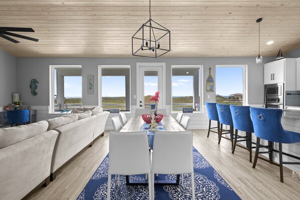 The living area on the 3rd floor offers a 75" LG TV, Bluetooth audio system, and a custom-painted surfboard by the late John Olvey. Relax on the plush seating while soaking in the Gulf views through five oversized windows. The 3rd-floor covered deck features comfortable seating and multiple pub tables with chairs, creating the perfect spot to enjoy meals and drinks, or simply relax while taking in the Gulf breeze. This floor also includes a Queen guest room with a stylish bath.