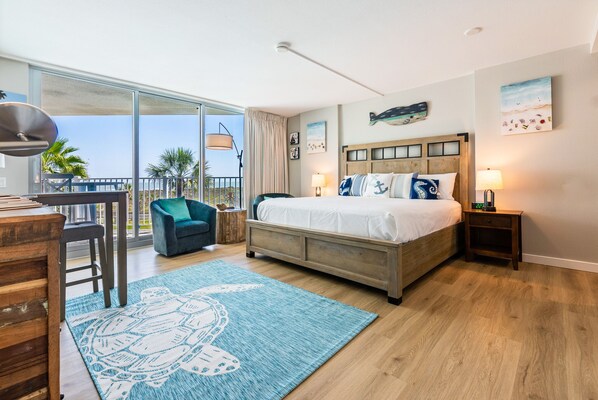 The kitchen has been completely updated with new cabinets, granite countertops and all new stainless steal appliances throughout. With comfort and luxury in mind this unit has a premium King size bed with top-of-the-line linens, furniture, décor, a smart TV and their own private balconies. High Speed Fiber Internet is available in every unit. The bathroom has a luxury walk in shower with sliding glass doors, large vanity and two closet for all of your belonging. This unit also has a stackable washer and dryer!