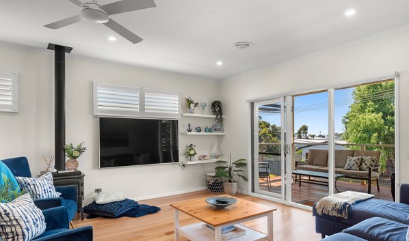 This lovely vacation home boasts 5 bedrooms and 2 bathrooms. It is conveniently located only a block away from the town center, within a mere 500 meters of distance. You can easily walk to shops, restaurants, RSL, and it's just 1km from the beach. The decor is modern, and the upper level features a newly renovated kitchen and an open plan living area that leads out to a deck with a BBQ and outdoor furniture. Upstairs, there are 2 bedrooms and 1 bathroom. Downstairs, you'll find an entrance to the living area, complete with a large TV and split system. There are also 3 bedrooms and 1 bathroom downstairs. All rooms are equipped with heaters, and there is central heating system for your comfort. You can enjoy playing pool, air hockey, and table tennis in the entertainment room located downstairs. The fireplace shown in the photo is an electric fire not wood.