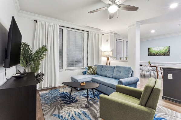 A dedicated workspace with an external monitor, ergonomic chair, and high speed internet allows you to stay productive during your stay. The living area is bright and welcoming, creating the perfect space to relax after a long day. Smart TVs in both the living room and bedroom provide entertainment whenever you need it.