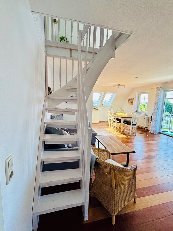 The apartment has 2 bedrooms, a bathroom with shower, guest toilet and a living room with integrated kitchen. The living room couch can be converted into a sofa bed. Furthermore is an extra bed available. Thus, up to 7 people have a place to sleep.