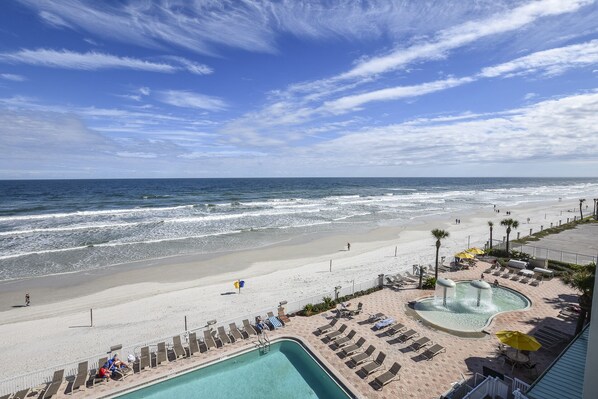 Located on the 11th floor of the Daytona Beach Resort, the studio sleeps 3 comfortably and offers all you’ll need for a weekend or week’s stay. When it’s time to head to the beach, you’ll find it right out the doors of the building and across the pool deck. You can also drive on the beach if you want! If you’re wanting to do a little shopping, guests can find a grocery store, pharmacy, and other shops in the center directly across the street from the building.