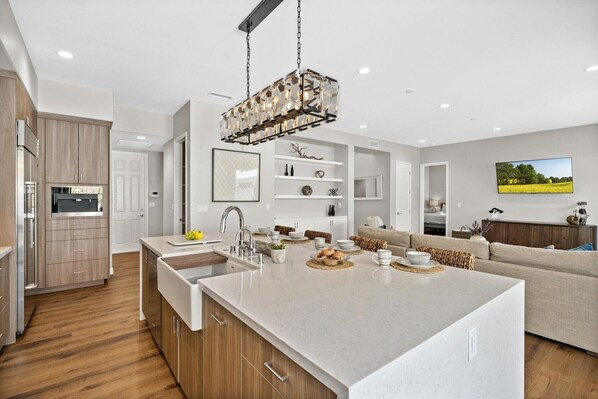 As you step inside, you'll be greeted by an elegant and spacious living area adorned with tasteful décor and furnishings. The open-concept design seamlessly connects the living area to the fully equipped gourmet kitchen, allowing you to whip up culinary delights while engaging in conversation with friends and family.