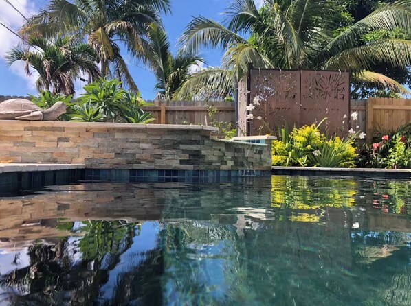 Modern, renovated 1,500 sq ft bungalow home with a gorgeous large onyx pool, sun shelf, hot tub, hammock, hanging bed and outdoor teak table and beds for everyone. Fruit trees, seasonal! HUGE lovesac oversized luxury sofa. Master bedroom has Beauty Rest mattress and adjustable bed frame. Epic pool/spa. On the edge of city life, in the suburbs!
