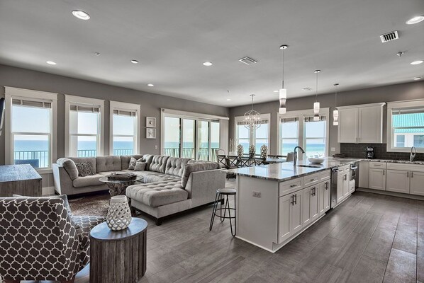 Luna Sol is a luxury, gulf-front duplex house located directly on the beaches of Destin, Florida. Comprised of Luna Plata and Sol Dorado, the combined property sleeps 44 guests! This is the ideal home for a group getaway. It makes a great spot for any vacation or getaway, directly on the beach. There are fourteen total bedrooms and four bonus bunk nooks. The duplex is comprised of two connected units – each with seven bedrooms and mirrored floor plans. There are 10 king suites, 4 guest suites with 2 queen beds in each, and 4 bunk nooks. Each suite has its own private, ensuite bathroom and flat screen TV.