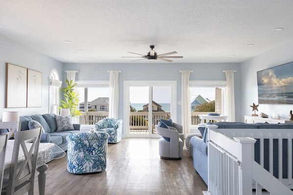 Nor Easter is an adorable 5-bedroom, 4-bathroom Oceanview Duplex (east side) beach retreat in the Spinnaker's Reach Community conveniently located just one house away from the community pool and beach access! You can take in great views of the beach from inside the home from multiple rooms and outside on the multi-level decks!