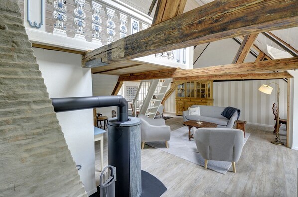 The apartment on the top floor can be reached via stairs. The historic, steep and winding staircase in the stairwell does not comply with current building regulations, but is protected. It is therefore unsuitable for guests with walking difficulties.