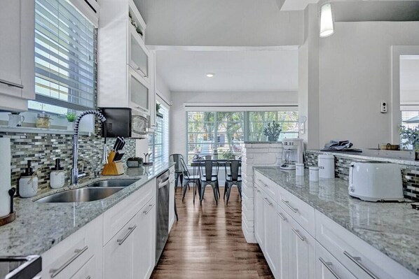 KITCHEN 1 - This kitchen includes a granite top island breakfast bar, a large beautiful dinner table and chairs, Bar top with stools, all new stainless steel appliances which include the following: Dishwasher, fridge & freezer, Mini Fridge (Wine Cooler) microwave, oven, and stove. This kitchen offers all cooking necessities such as silverware, dishes, pots and pans, glass cups, wine glasses & champagne glasses. Also includes a toaster, Keurig coffee maker, tea maker, blender, barbecue utensils, all commonly used condiments, and all cooking basics!