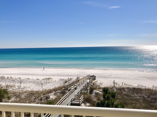 Our lovely condo is on the 5th floor (#502) of 6-story building directly on the Gulf of Mexico; 1 of only 10 Gulf-front units available at the Destin West Complex. It is beautifully decorated in a 'Pottery Barn-Beachy-Comfy' type feel. Our kitchen is fully equipped with everything you might need to feel like you are home, including a regular coffee pot and a kcup maker. All 4 rooms have Flat Screen TVs. The Living Room has a 55" Flat Screen TV. The Master, Guest, & Bunk area also have Flat Screen TVs. We also have a sleeper sofa with a memory foam mattress in the Living Room. The Master and Guest rooms also have Memory Foam mattresses.
