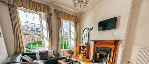 APARTMENT HAS TWO BEDROOMS. THE STUNNING MASTER BEDROOM IS EXCEPTIONALLY LARGE, INCLUDES AN EN-SUITE BATHROOM, COMFORTABLE KING-SIZE BED AND FITTED WARDROBES. THE ATTRACTIVE DOUBLE BEDROOM WITH WALK IN WARDROBE AND VANITY/DESK SPACE. ADDITIONAL GUEST CAN REQUEST SOFA BED TO BE MADE ON ARRIVAL. THE KITCHEN IS FULLY FITTED INCLUDES FRIDGE/ OVEN/ MICROWAVE/TOASTER/WASHING MACHINE/ UTENSILS/ POTS PANS/ PLATES/ NESPRESSO COFFEE MACHINE. PERFECT DINING AREA SEATS UP TO 6 PEOPLE. THE BRIGHT LIVING ROOM WITH FIREPLACE HAS A 42” SMART TV INCLUDING NETFLIX/DISNEY PLUS/ AMAZON PRIME/ BBC IPLAYER. THE LARGE SOFA ALLOWS SEATING FOR UP TO 8 PEOPLE, ALONG WITH A SINGLE ARMCHAIR. RADIANT FULLY FITTED 3-PIECE FAMILY BATHROOM.