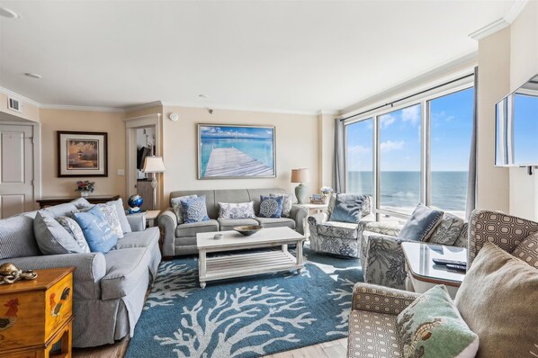 The open floor plan allows guests to converse while in the living room, kitchen, dining area or out on the balcony. The updated, fully equipped kitchen has new cabinets, granite counters, stainless steel appliances, smooth top range located in the updated island and breakfast bar with seating for five. The kitchen also has a washer and dryer for added convenience. The living room has ample seating with a queen sleeper sofa, love seat, two coastal themed swivel chairs, one armchair and a 39" TV mounted on the wall. A slider door leads to the balcony with a table with six chairs. The adjacent dining room has a table and six matching chairs with a door leading to the shared balcony with living room.