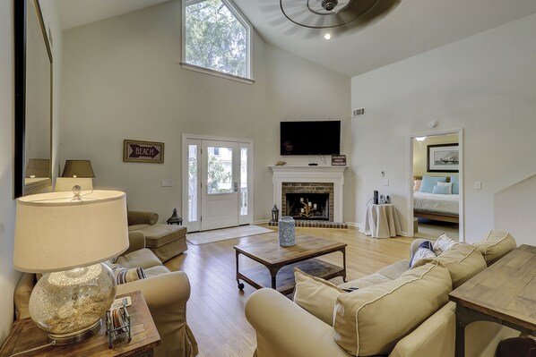 Upon entering the home, you are instantly greeted with an expansive great room with 2-story vaulted ceilings and stylish plank wood flooring. The start of this great room is the living area with ample seating for the entire family to spread out while watching their favorite shows and movies on the large flatscreen TV.