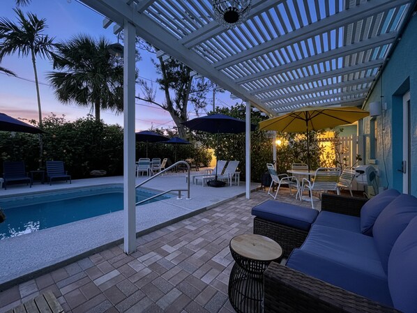Step outside to discover a large shared pool in the backyard, where you can soak up the sun or take a refreshing dip. Each unit also has its own separate patio and grill, perfect for enjoying a delicious barbecue under the stars. For those chilly evenings, you have the option to heat the pool above 75°F for an additional $150 for a week-long stay. Just let us know in advance, and we’ll have it ready for your arrival!