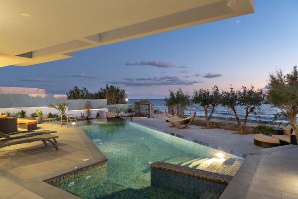 At the heart of this outdoor paradise is a pristine 52 sq.m infinity pool (1.5m-deep), its sparkling waters inviting you to take a refreshing dip or simply float and unwind. The pool's design seamlessly blends with the surrounding landscape, creating a tranquil oasis that reflects the azure hues of the sea beyond. Next to the pool, a built-in whirlpool with hydromassage (4 high-tech swim jets) is perfect for exercise or relaxation. The pool and whirlpool can also be heated upon request, with an additional daily charge for the entire duration of your stay. The area around the pool is equipped with day beds, loungers, and poolside shower, all having direct unobstructed, mesmerizing sea views of Libyan sea, evidence to Crete’s world-famous element: the clear blue waters.