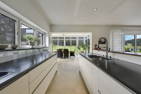 Located in the impressive Alpine foothills on the outskirts of Inzell, the light-flooded Panorama holiday apartment is on the ground floor of a country house and combines comfort with top modern design. The apartment is furnished with an elegant floor and has an open plan living room with a well-equipped kitchen, a winter garden with a dining area and a comfortable sitting area, 2 bedrooms as well as one bathroom and can therefore accommodate 4 people.