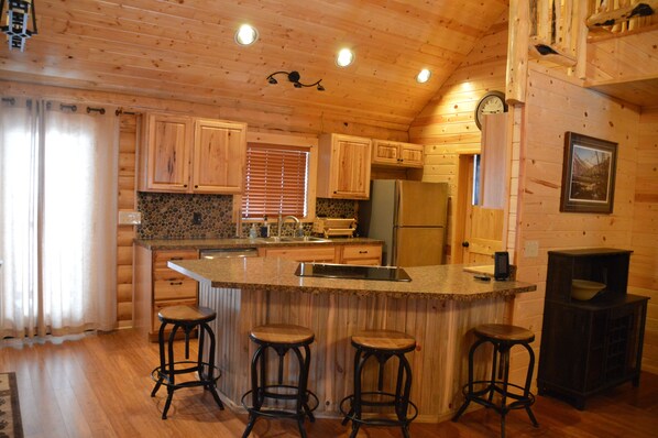 Our cabin has 2 bedrooms and 1 full bath on the main level with an open living room, dining room, kitchen area. There is a loft area upstairs with 2 queen beds and a bathroom with a shower. The kitchen is fully furnished with everything you will need for preparing meals. I have some spices, oil, Pam spray, sugar, brown sugar, flour, etc. I also will try to always have instant oatmeal, pancake mix/syrup, little boxes of cereal and hot chocolate, coffee. At least something to get you started if you get in late. You are close to restaurants a few within 5-10 minutes and many options 10-35 minutes away. There is the Robins Roost grocery store about 10-15 minutes away.