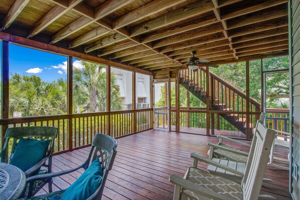 If you decide to book this charming home located in a residential beach community, you and your guests will enjoy a quiet and restful vacation. Swing your worries away in the screened-in porch or enjoy a meal while listening to the sounds of the surf. The convenient screened-in porch features plenty of comfortable seating for everyone including an outdoor dining area. Spend a wonderful time while cozying up in the living area after spending the day at the beach.
