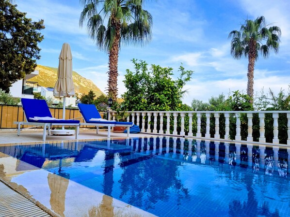 The nicely finished villa with private swimming pool (6m x 4m, 1.8m deep) sleeps 6 adults comfortably in its 3 air conditioned bedrooms (2 double, 1 twin) with a large sea view balcony. The pool is maintained daily so retains its crystal clear water. The view over Kalkan bay with its turquoise coast is gorgeous. The open plan kitchen adjoins the spacious sitting room with sliding doors to the terrace with a private swimming pool. The villa is surrounded by a beautiful mature garden with many exotic flowers and trees, which offer shade and privacy. The expansive roof terrace is very relaxing due to its stunning views of the surrounding mountains and Kalkan bay.