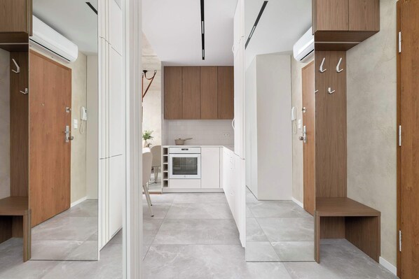 The interior impresses with its functionality and attention to detail. A sunny balcony invites you for morning coffee from the machine, and the fully equipped kitchen with a dishwasher makes daily life easier. Relaxation after a busy day is guaranteed by two Smart TVs and a bathroom with a bathtub and washing machine. For business travelers, high-speed internet and the possibility of issuing a VAT invoice are available.