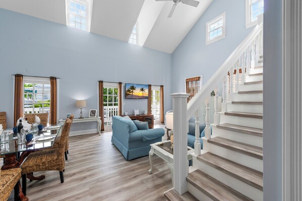 Climb the stairs to your personal Key West retreat with gorgeous high ceilings all throughout. The first bedroom downstairs has a queen-sized bed with an ensuite bathroom. The loft primary bedroom has a king-sized bed, queen-sized sleeper sofa, and an ensuite bathroom. The living room is also furnished with a queen-sized sleeper sofa and flat-screen TV.