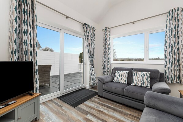 Comfy sofas, nest of side tables and TV, the perfect place to relax and watch your favourite shows after a day exploring or enjoying the beach. French doors open out on to a small, decked area.