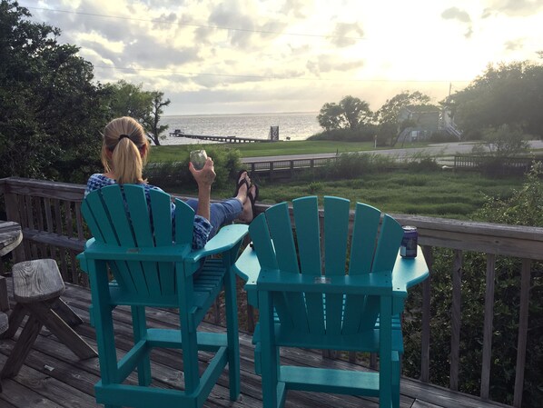 Back deck with view of Currituck Sound - gorgeous sunsets! Front deck off 2 of the 3 bedrooms. Short walk to the ocean, beautiful sunrises! 2.5 mi. north of "downtown" Duck with paved walk/bike path all the way! 1.4 mi. south of The Sanderling Resort!