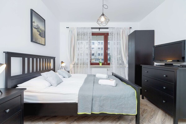 This beautiful, spacious 100m2 apartment is situated on the ground floor and can accommodate 6 people. Guests have at their disposal 3 bedrooms, an independent kitchen and 3 bathrooms with a shower. Each bedroom has a comfortable, large double bed, wardrobe / chest of drawers and a TV with satellite programs. The apartment is distinguished by a modern and luxurious design and functionality. Pleasant design and comprehensive equipment necessary for kitchen and bathroom accessories guarantee a comfortable stay. The apartment also includes a large terrace with a garden. On the terrace you will find a table and 6 chairs for even greater comfort. We also invite people with pets. There is an additional fee.