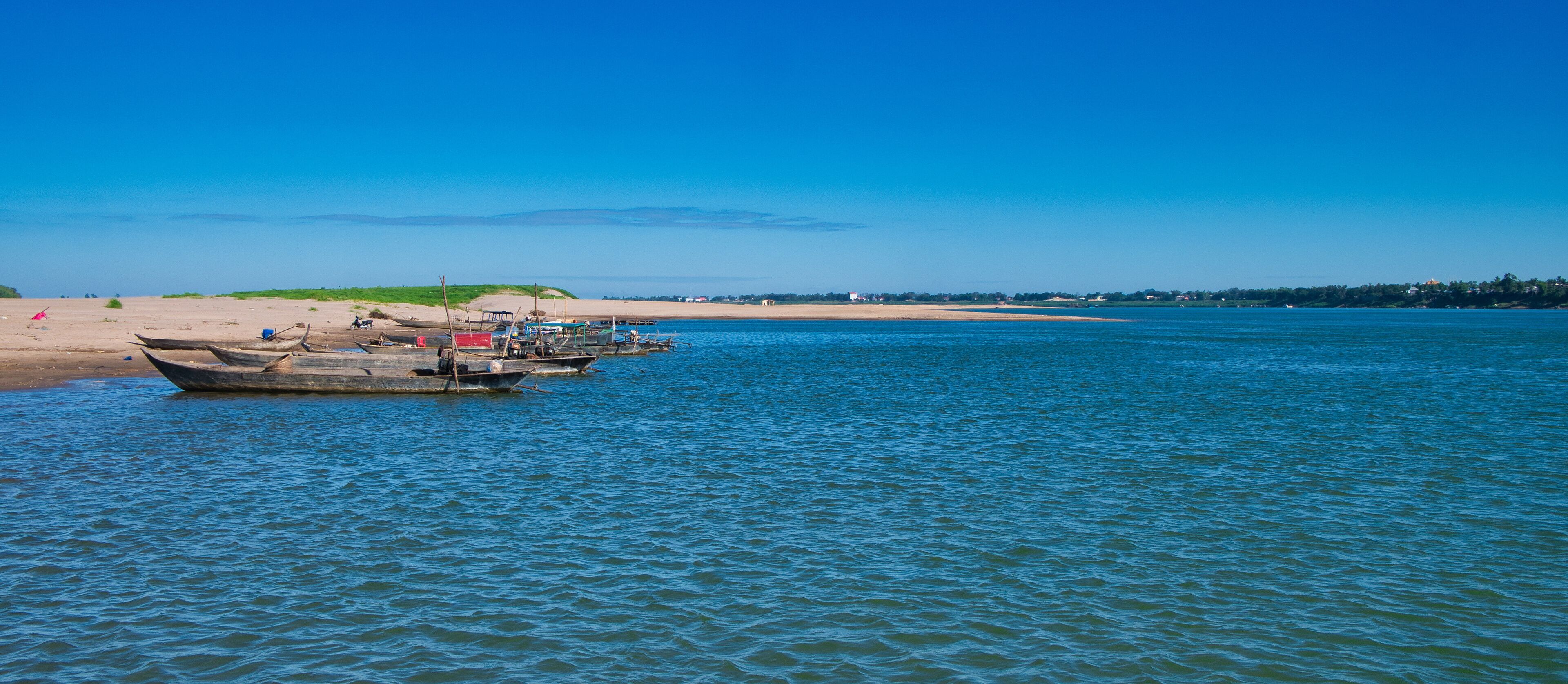 Fishing boats on a beach at Kaoh Trung, an island in the Mekong River near Kratie, Cambodia