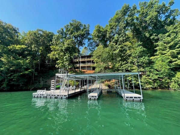 Private Dock: Descend 88 steps to your private double-slip dock with deep year-round water, a jump platform, and a large patio for sunbathing, swimming, and relaxing on the lake.