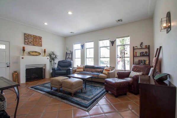 -Living room: As you enter the main living area, you'll appreciate the high ceilings and great views of the pool area from the front door. The main living area is bright, open and airy with fresh decor and a lively Santa Fe vibe accented throughout the house. The Saltillo tiles (terra cotta) are warm and inviting--they're cool in the summer and naturally warm in the winter. Enjoy the huge 55" 4k screen with X-box, Netflix and a huge movie supply for every age & taste. Cozy up to the blazing fireplace on cooler nights with a glass of wine and a great book (we've supplied shelves of them) or the latest magazines. The atmosphere is as comfy as our sofas.