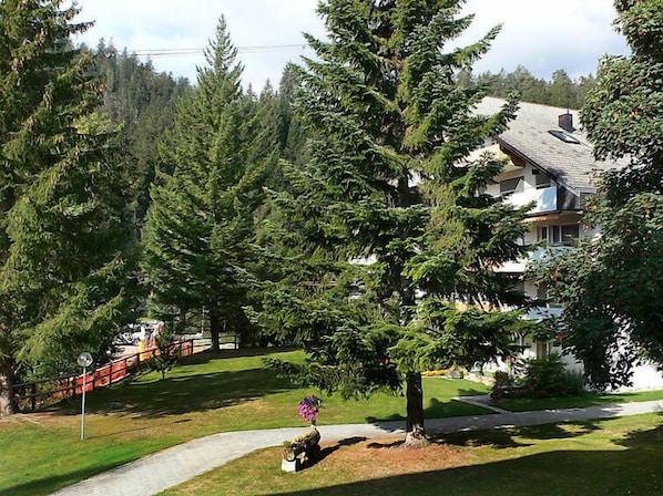1-room apartment 32 m2, north-west facing position. Comfortable and cosy furnishings: living/dining room with 2 fold-away beds and satellite TV (flat screen), radio and CD-player. Exit to the balcony. Kitchenette (oven, 4 ceramic glass hob hotplates) with dining table. Bath/WC. Small balcony, north facing position and west facing position. Partial view of the mountains and the countryside. Facilities: Internet (WiFi, free). Garage space n 7-5 at the house, height 194 cm. Please note: non-smokers only. No skis and ski boots allowed in the apartment in the winter.