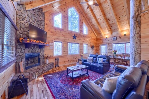 Location, location, location! This beautifully appointed log cabin is within walking distance to Old Man's Cave! Sleeps 8 comfortably. It's situated on a private gated lot on a secluded wooded 6 acres. 3 Private bedrooms, 3 Full baths. Each private bedroom has a Queen bed, and there are two Twins in the loft area. The finished lower level has a pool table and there are two stone wood-burning fireplaces. One indoor AND one outdoor. You will enjoy taking a soak in the hot tub after a long day of hiking under the covered deck, or relax and enjoy a game of pool in the finished lower-level entertainment area. Fully equipped kitchen with cooking essentials included to prepare your meals! This retreat is a perfect family vacation spot, and it's so close to the local parks and Hocking Hills attractions! Four Wheel Drive is required in inclement weather.