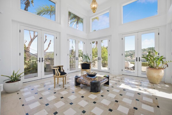 The grand living room, centered around a stately fireplace and framed by dramatic picture windows, invites relaxed conversation and elegant entertaining. Nearby, a sunroom bathed in golden sunlight—with French doors and transom windows—offers a cheerful space to unwind, read, or sip a glass of wine while soaking in the view.