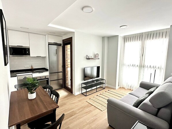 The kitchen is equipped with a ceramic hob, microwave, large refrigerator, dishwasher, and washing machine, along with the essential kitchen utensils you may need during your stay. Feel like a movie night? Enjoy the Smart TV with major streaming applications to access with your own user and relax just like at home. Also, benefit from high-speed fiber optic internet connection (300 mbps) in case you need to work comfortably during your stay.