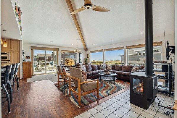 The spacious, exceptionally well-lit, open-concept main living area features vaulted ceilings, large windows, and a seamless flow between the kitchen, dining, and living spaces. The well-stocked kitchen is a cook's delight, boasting an oven and a microwave that also functions as a convection oven, ample counter space, and seating for four at the extended countertop. Gather around the dining table, which comfortably seats ten, and enjoy meals with stunning ocean views.