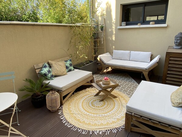 ☀️ For quieter moments, a north-facing patio offers a shaded retreat, perfect for relaxing away from the summer heat. Everything you need for a perfect stay is provided: sun loungers, water games, pétanque balls, and more!