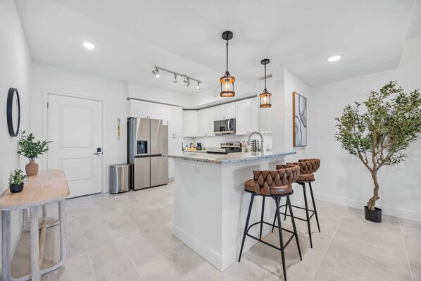 Indulge your culinary tastes in the expansive, fully equipped kitchen complete with brand new top-of-the-line appliances and sleek finishes. Gather around the spacious dining table to enjoy your culinary creations while enjoying the company of loved ones. Afterward, unwind in the inviting living room, equipped with a 65-inch TV and ample seating for everyone to unwind and entertain.