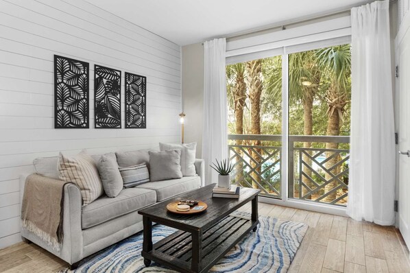 At this stylish condo within the Sandestin Resort, enjoy a Juliet-balcony view of luscious palm greenery and easy access to Baytowne Wharf's amenities. Unwind with luxury bedding, cook in the kitchenette, watch your favorite shows on TV and use resort facilities like a zero-entry pool and gym.