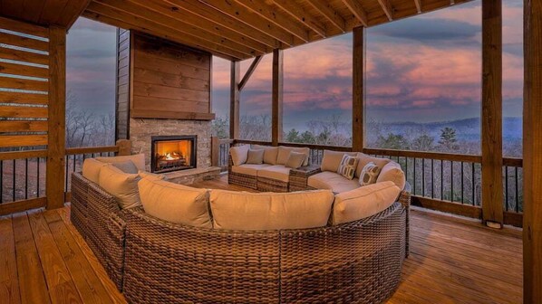 Outdoor - covered main level deck, wood burning fireplace, 65” Smart TV sectional sofa, outdoor dining table seats 8, gas grill; downstairs covered deck, gas fireplace, sectional sofa, ping pong table, hot tub seats 6, infrared sauna
