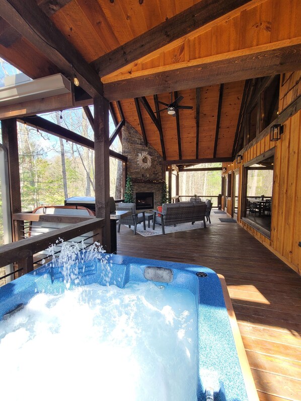The back porch just as impressive as the rest, the covered outdoor space exceeds the normal porch and boasts a dining room table, a hot tub for unwinding after a hard day of relaxing. Gas grill for all your cooking pleasures. Pour the wine, nestle on the patio furniture and nuzzle around the outdoor one-touch gas fireplace. Party lights, Christmas pines, and a dressed mantle enhance your ambience. Watch wildlife, disappear in the treetops, warm your hearts and steam your cares away.