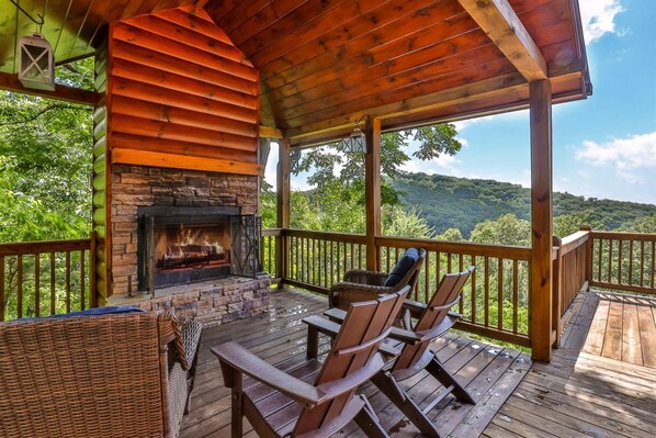 Dine outdoors with the most fantastic backdrop while the crackles from the wood-burning fireplace pop behind the scenes.