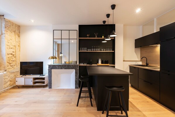 - A fully-equipped kitchen with electric kettle, oven, toaster, dishwasher, hotplates, etc.