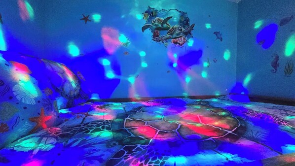 The tubing on the wall in the child’s play/sleeping area is a scarf launcher. Simply drop the foam balls into the opening on the acrylic box, then watch as they shoot through the clear tubing and pop back out onto the floor — always a big hit with kids!