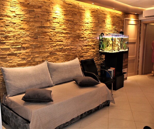 Aquarial Home in Chora Naxos offers a unique retreat with its rock-styled walls and an aquarium. Unwind in the heart of this beautiful neighborhood, just minutes from the beach, town center, traditional market in the old castle and Temple of Portara.