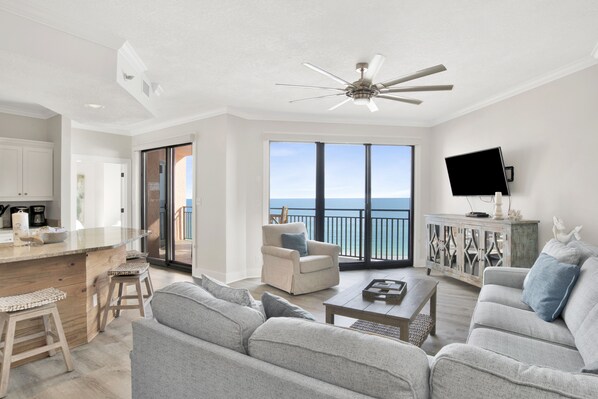 Escape to coastal luxury at SeaChase 802W, a beautifully decorated 3-bedroom, 2-bath Gulf-front condo offering 1,542 sq. ft. of bright, inviting living space—perfect for families and groups of friends. Breathtaking panoramic views of the Gulf of Mexico greet you the moment you step inside, and the private balcony is the ideal spot to enjoy morning coffee or evening wine as the sun sets over the water.