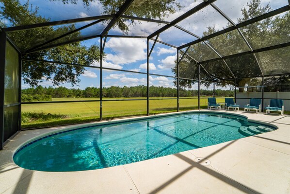 With 4 bedrooms and 3 bathrooms, Sun Chaser Villa provides plenty of open space for comfortable movement throughout. Enjoy stunning views of the pool and natural wetlands from nearly every corner of the home. Step into your backyard oasis, featuring a screened-in pool that overlooks the serene beauty of the surrounding natural landscape.