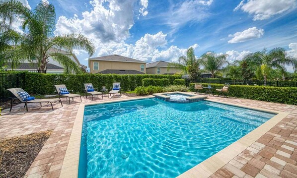 A private swimming pool and spa are right outside your patio doors for well-needed relaxation in a vacation home to remember! Speaking of fun in the sun make sure you take a short stroll to explore the Encore Resort offering exclusive on-property amenities including a water park with a thrilling drop and twisting slides, multiple restaurants and bars, sport courts, and an amenity center with a fitness room and kid s play area. The resort, less than a 10-minute drive to Disney World, offers free shuttle service to the parks.