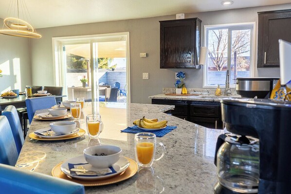In the kitchen, start your morning at the coffee bar with a variety of brews, teas, and hot chocolate. Toast a bagel, then head out for adventure. We'd like to invite you to take a break from cooking and embrace your vacation fully by dining out or ordering in from nearby eateries. For those who absolutely insist on cooking (we tried!), we’ve got you covered with basic utensils, pots, pans, a Crockpot, and even a spice collection. There's also a propane grill on the back patio. Enjoy the sizzle, grill and chill.